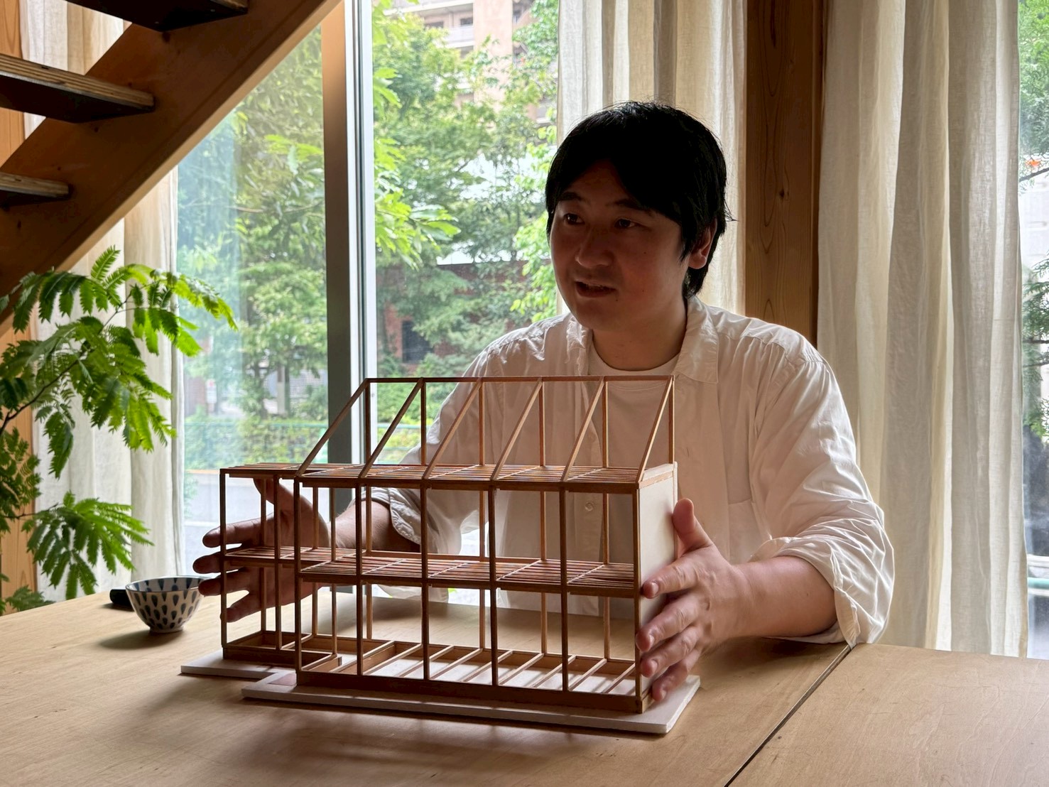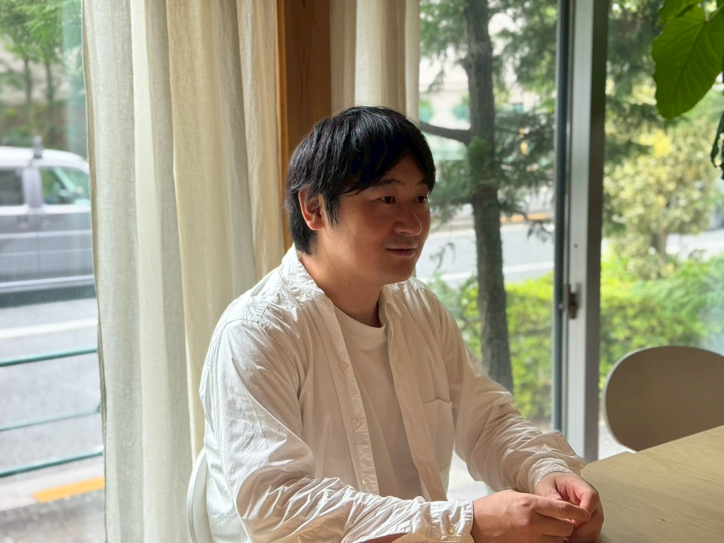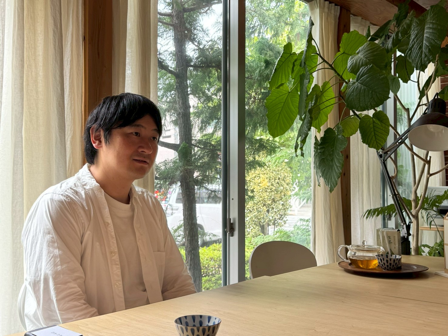 ―今日はお時間をいただきありがとうございます。道路に面した細長い形、開放的な窓が印象的な事務所ですね。