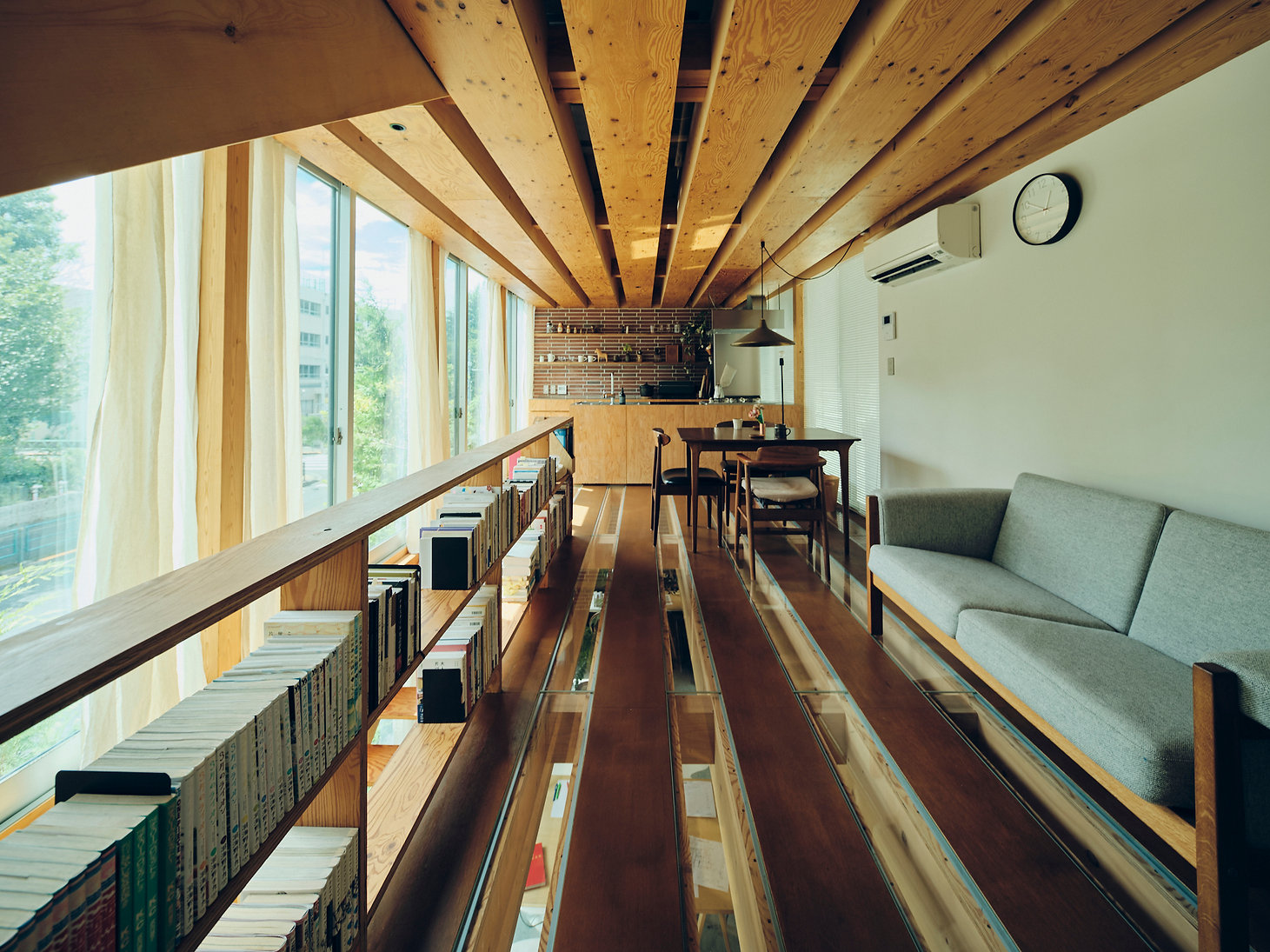 日中は、天井のガラスのスリットから光がふんだんに入ってくるので、中にいても外にいるような開放感で過ごせます。この敷地は間口が約15メートル、奥行きが4メートルという狭小住宅です。